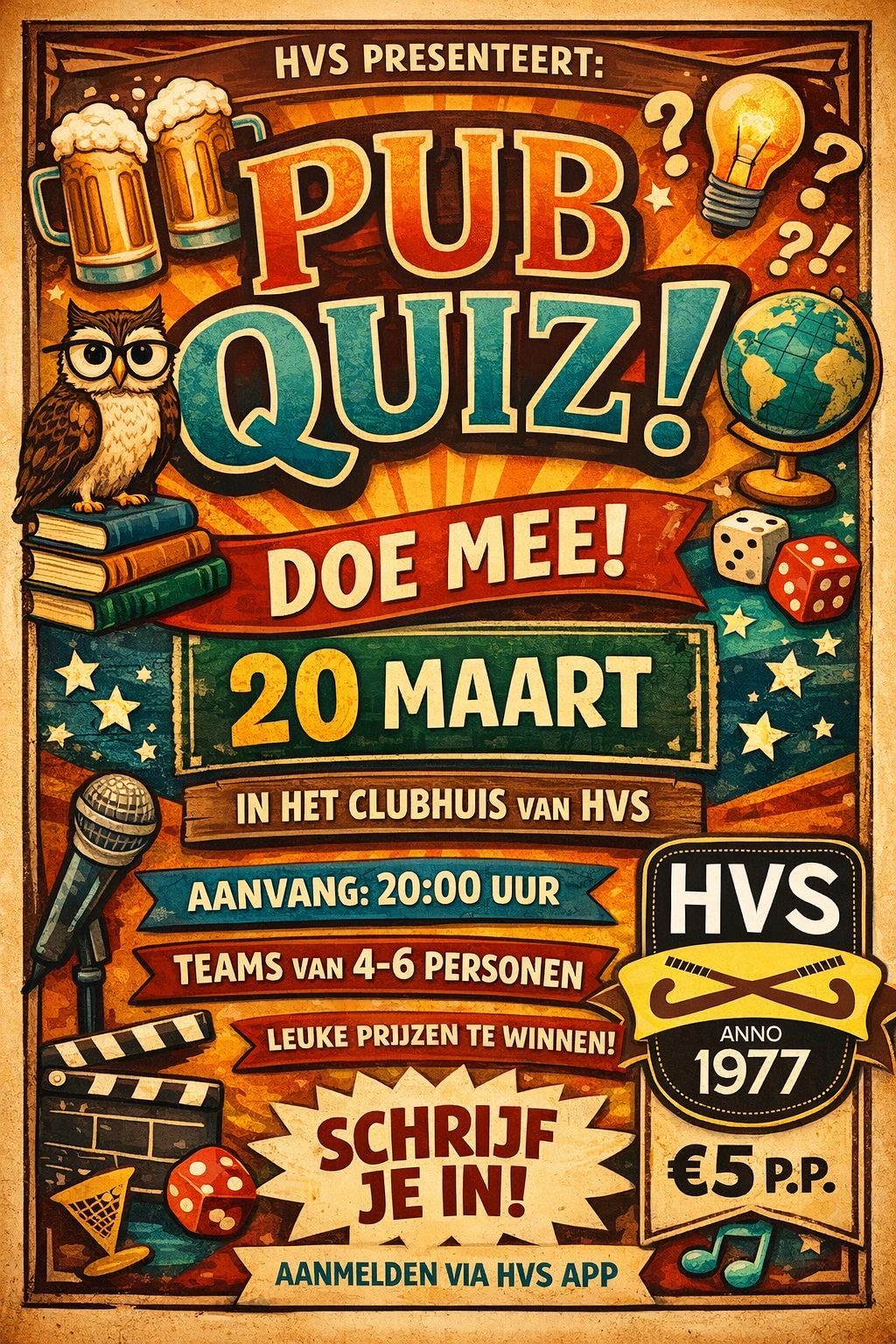 Vrijdag 20 maart organiseren we samen met café Merz een leuke pub quiz in het clubhuis van HVS!